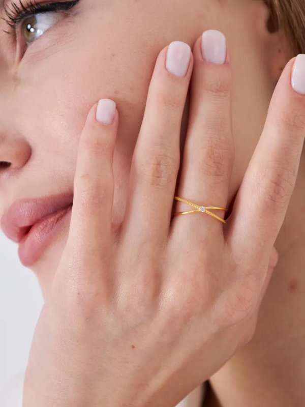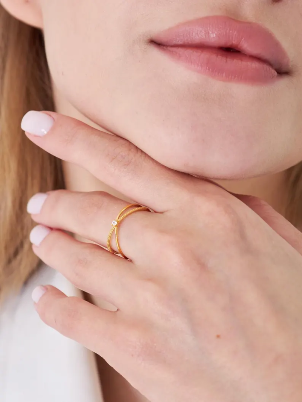 💫 Grace meets geometry in this minimalist gold ring designed with a unique crossover silhouette. A subtle crystal accent adds just the right touch of sparkle, making this the perfect piece for women who love understated elegance.