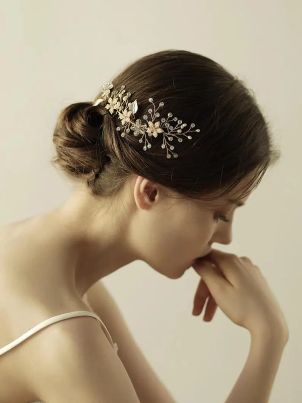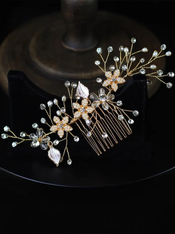 This product is a bridal hair accessory, specifically a gold-toned hair comb adorned with pearls and crystals, featuring floral and leaf designs. The product is a bridal hair comb, specifically a decorative hair accessory designed for weddings or formal occasions.