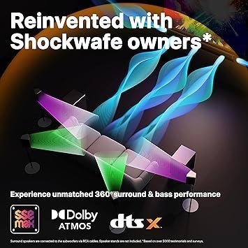 - SUPERCHARGED DUAL 10” WIRELESS SUBWOOFERS (INDUSTRY-EXCLUSIVE) propel bass performance to new heights, featuring upgraded high output amplifiers (up to 600W) and subwoofer drivers that harness effortless power, transforming your entire room into a sweet spot filled with thunderous, yet balanced lows as deep as 20Hz without any localization or distortion even at cinema-level volumes. Real bass is felt, not heard. Our system showcases TWO subwoofers which are a must for the ultimate home theater.