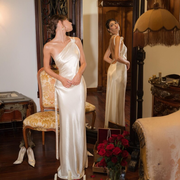 Designed for women who appreciate pure silk elegance, this long silk dress combines contemporary minimalism with the grace of vintage fashion. Whether you’re walking down the aisle in an intimate ceremony, celebrating love under candlelight, or posing for an editorial shoot, Pearl Empress delivers quiet sophistication in every movement.